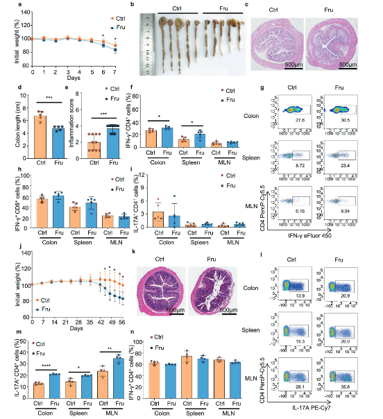 在高果糖和正常饮水处理的小鼠中建立DSS诱导的结肠炎模型,果糖组小鼠比对照组表现出更显著的体重下降(图2a)。为验证结肠炎严重程度,采集小鼠结肠分析其长度及炎症情况,发现果糖组结肠长度相对较短,且炎症程度显著重于对照组(图2b-e)。通过流式细胞术分析免疫反应发现,高果糖处理小鼠的结肠和脾脏中Th1细胞比例显著升高(图2f,g),高果糖水喂养小鼠的结肠、脾脏及肠系膜淋巴结内Th17细胞比例显著升高(图2l,m),而两组结肠中的Tr1、Th2和Treg细胞比例也无显著变化(图2h,i)。这些数据表明,在DSS诱导的结肠炎模型中,高果糖依赖 Th1/Th17 细胞加剧 IBD。