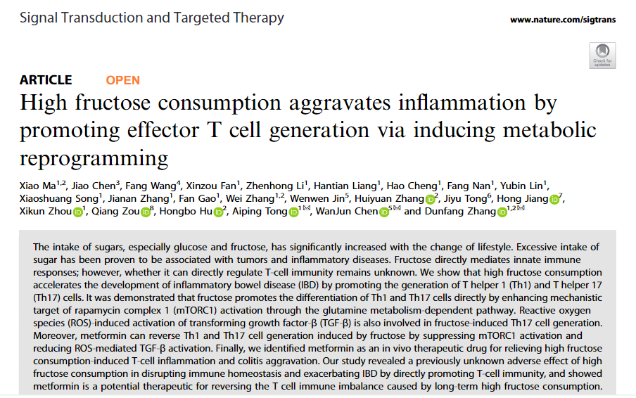 [1] Ma, X., Chen, J., Wang, F. et al. High fructose consumption aggravates inflammation by promoting effector T cell generation via inducing metabolic reprogramming. Sig Transduct Target Ther 10, 271 (2025). doi: 10.1038/s41392-025-02359-9.(IF:52.7)