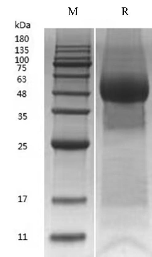 Human Fetuin A Protein on SDS-PAGE under reducing (R) condition. The purity is greater than 95%.