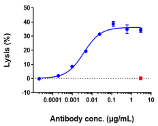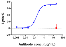 Anti-CD20 Reference Antibody (rituximab)-induced CDC activity was evaluated using Raji Cell. The max Lysis rate was approximately 74%.
