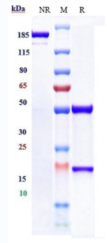 Anti-FcRn (FCGRT & B2M) Reference Antibody (nipocalimab) on SDS-PAGE under reducing (R) condition. The purity of the protein is greater than 95%.