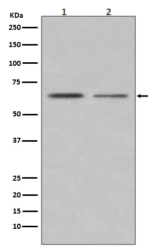 Western blot analysis of ER alpha in (1) MCF-7 lysates; (2)T47D lysates using Estrogen Receptor alpha antibody.