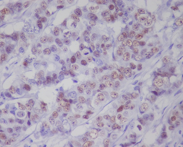 Immunohistochemistry analysis of paraffin-embedded Human breast using Phospho-p53 (S392) antibody.High-pressure and temperature Sodium Citrate pH 6.0 was used for antigen retrieval.