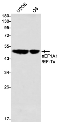 Western blot analysis of eEF1A1/EFTu in U2OS, C6 lysates using eEF1A1/EFTu antibody.