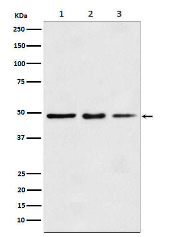 Western blot analysis of eEF1A1 in (1) MCF-7 lysates; (2) mouse kidney lysates; (2) rat spleen lysates using Elongation Factor 1A1 antibody.