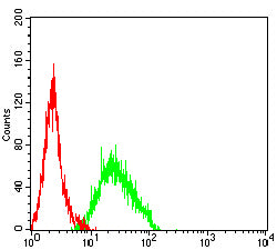 Flow Cytometry analysis of HL-60 cells using Melanocyte Protein PMEL antibody (green) and negative control (red).