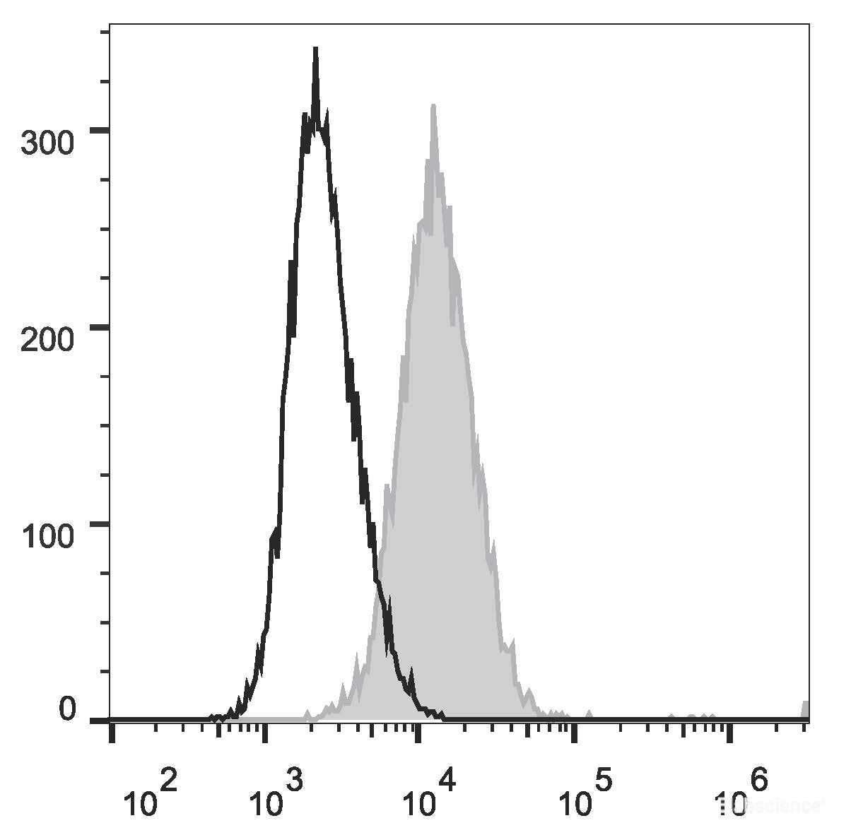 Flow Cytometry analysis of C57BL/6 murine splenocytes stained with CD34 antibody (PE).Rat IgG2a Isotype Control PE (empty blackhistogram).