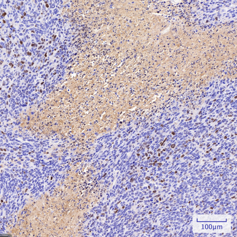 Immunohistochemistry analysis of paraffin-embedded Human liver cancer in Chimera mouse using Ki67 antibody. High-pressure and temperature Sodium Citrate pH 6.0 was used for antigen retrieval.