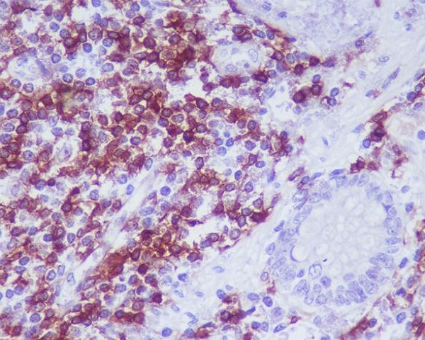 Immunohistochemistry analysis of paraffin-embedded Human colon using CD4 antibody.High-pressure and temperature Sodium Citrate pH 6.0 was used for antigen retrieval.