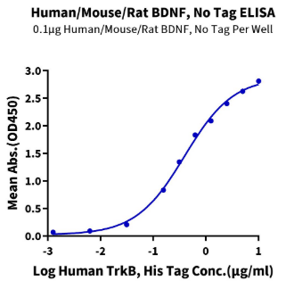 Immobilized Human/Mouse/Rat BDNF, No Tag at 1 μg/ml (100 μl/well) on the plate. Dose response curve for Human TrkB, His Tag with the EC50 of 0.39 μg/ml determined by ELISA