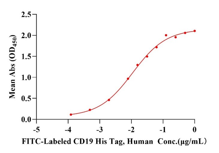 Immobilized Anti-CD19 Antibody, Mouse Monoclonal at 0.5μg/mL (100μL/well) can bind Human FITC-Labeled CD19 His Tag with EC50 of 10.98g/ml.