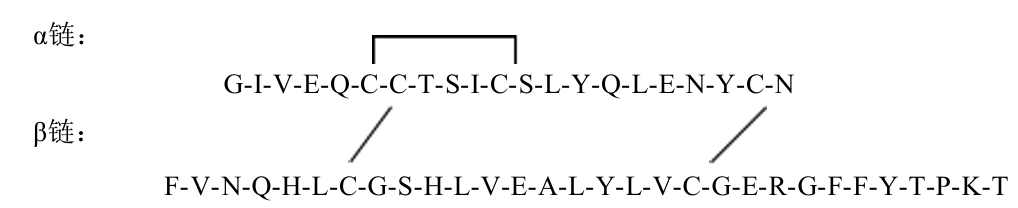不同物种胰岛素功能大体相同,只是氨基酸组成上的差异。人胰岛素结构见下: