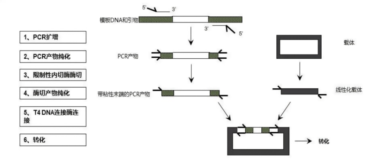 原理:先通过 PCR 扩增获得目的 DNA 片段,再用限制性内切酶分别切割目的片段与载体,使其产生互补的粘性末端(含单链突出区)或平末端(无突出区),随后在连接酶作用下将目的片段与载体连接形成重组载体,最后将连接产物转化至宿主细胞,经涂板培养与阳性克隆鉴定得到目标重组载体。
