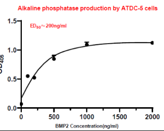 图6.The ED50 as determined by inducing alkaline phosphatase production of murine ATDC5 cells is 200 ng/mL, corresponding to a specific activity of > 5.0 × 103 IU/mg.