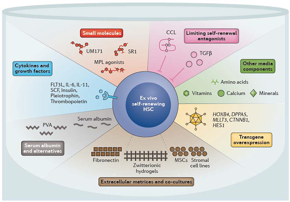 因采集HSC数量不足造成部分技术瓶颈,通过对体外培养实验分离出的造血干/祖细胞(hematopoietic stem/progenitor cells,HSPC)添加造血细胞因子、筛选活性化合物、基质细胞共培养、材料模拟骨髓微环境及基因编辑调控等手段,力求在体外实现HSC高效扩增与自我更新能力的同步维持。