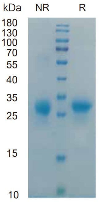 2 ug/lane protein was resolved with SDS-PAGE under non-reducing (NR) and reducing (R) conditions and visualized by Coomassie Blue staining.