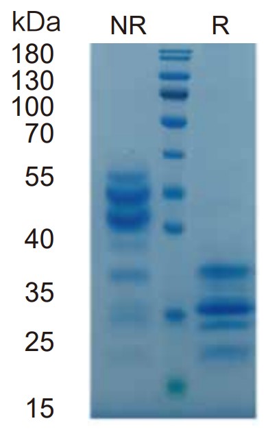 4 ug/lane protein was resolved with SDS-PAGE under non-reducing (NR) and reducing (R) conditions and visualized by Coomassie Blue staining.