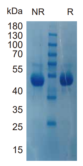2 ug/lane protein was resolved with SDS-PAGE under non-reducing (NR) and reducing (R) conditions and visualized by Coomassie Blue staining.