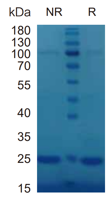 4 ug/lane protein was resolved with SDS-PAGE under non-reducing (NR) and reducing (R) conditions and visualized by Coomassie Blue staining.
