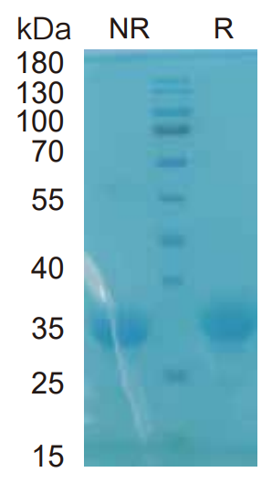 4 ug/lane protein was resolved with SDS-PAGE under non-reducing (NR) and reducing (R) conditions and visualized by Coomassie Blue staining.