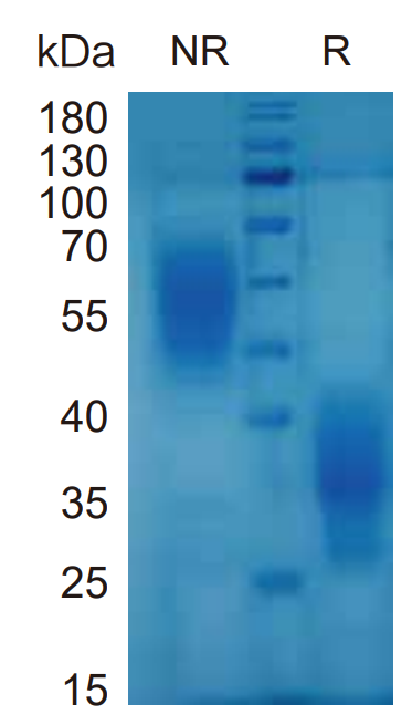 4 ug/lane protein was resolved with SDS-PAGE under non-reducing (NR) and reducing (R) conditions and visualized by Coomassie Blue staining.