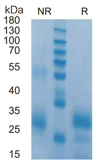 4 ug/lane protein was resolved with SDS-PAGE under non-reducing (NR) and reducing (R) conditions and visualized by Coomassie Blue staining.