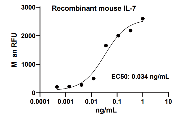 白细胞介素 7(IL-7)是血细胞生成素家族中的一种 25 kDa 细胞因子,在淋巴细胞分化、增殖和存活中起重要作用。小鼠 IL-7 与大鼠 IL-7 的 aa 序列同一性约为 88%,与人类、马、牛、绵羊、猪、猫和犬 IL-7 的 aa 序列同一性为 58-60%。人类和小鼠 IL-7 表现出跨物种活性。IL-7 由初级和次级淋巴组织中的多种细胞产生,包括胸腺、骨髓和肠道的基质上皮细胞。IL-7 有助于维持所有初始T 细胞和记忆 T 细胞,主要通过促进抗凋亡蛋白 Bcl-2 的表达。 IL-7 是 T 细胞发育所必需的,但不是 B 细胞发育所必需的 。?本品以液体形式提供,高活性、高纯度、低内毒素、无标签。