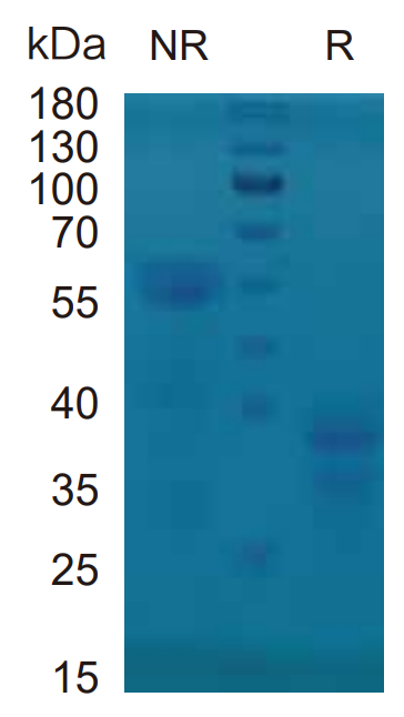 4 ug/lane protein was resolved with SDS-PAGE under non-reducing (NR) and reducing (R) conditions and visualized by Coomassie Blue staining.
