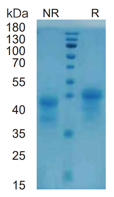 4 ug/lane protein was resolved with SDS-PAGE under non-reducing (NR) and reducing (R) conditions and visualized by Coomassie Blue staining.