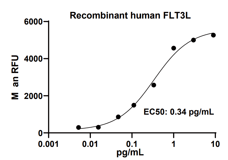 Measured in a cell proliferation assay using BaF3 mouse pro-B cells transfected with mouse Flt-3. The EC50 for this effect is 0.2-1 pg/mL.
