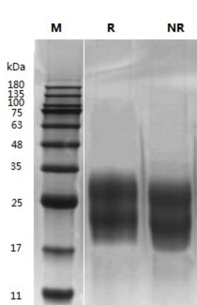 Human IL-12 Protein on SDS-PAGE under reduced (NR) and reducing (R) conditionscondition. The purity is greater than 95%.