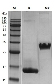 Human PDGF-BB Protein on SDS-PAGE under reduced (NR) and reducing (R) conditionscondition. The purity is greater than 95%.