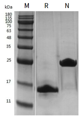 Human Activin A Protein on SDS-PAGE under reduced (R) and Non-reducing (NR) conditions. The purity is greater than 95%.