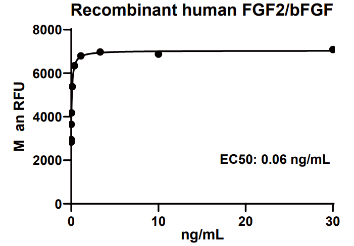 bFGF是成纤维细胞生长因子(FGF)家族的成员,是由FGF2基因编码的生长因子和信号蛋白。FGF家族成员具有广泛的促有丝分裂和细胞存活活性,并参与多种生物学过程,包括胚胎发育、细胞生长、形态发生、组织修复、肿瘤生长和侵袭。在正常组织中,bFGF存在于基底膜和血管内皮下细胞外基质中。bFGF是一种非糖基化的肝素结合生长因子,在大脑、垂体、肾脏、视网膜、骨骼、睾丸、肾上腺、肝脏、单核细胞、上皮细胞和内皮细胞中表达。bFGF/FGF-2,是所有胚胎和诱导多能干细胞培养基中维持多能性的基本成分。