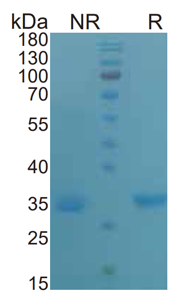 2 ug/lane protein was resolved with SDS-PAGE under non-reducing (NR) and reducing (R) conditions and visualized by Coomassie Blue staining.