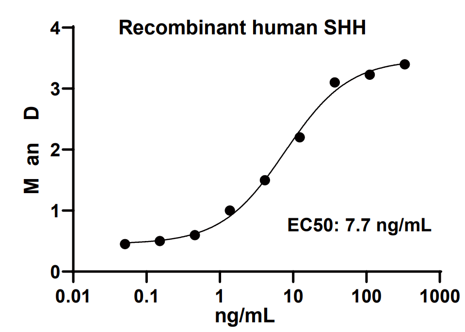Shh(Sonic Hedgehog protein)是一种信号分子,属于Hedgehog(Hh)家族中的一员。它在胚胎发育、组织再生和细胞增殖等生理过程中起着重要的调节作用。Shh蛋白通过与其受体Patched(Ptch)结合,激活G蛋白偶联受体Smoothened(Smo),进而激活Hh信号通路。该信号通路在胚胎期间参与形成各种器官和组织的定向发展,包括中枢神经系统、肢体、心血管系统等。由于Shh蛋白在发育和组织修复中的重要性,也被广泛研究用于干细胞培养、组织工程、药物开发等领域。