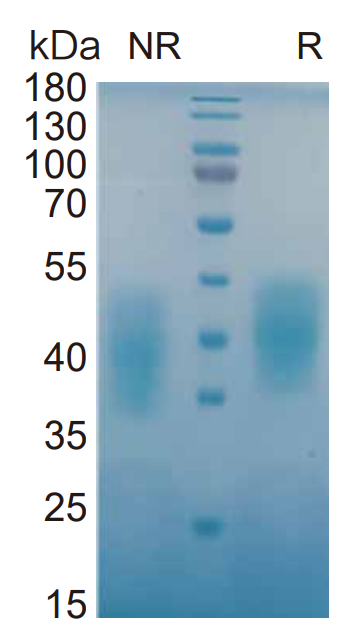4 ug/lane protein was resolved with SDS-PAGE under non-reducing (NR) and reducing (R) conditions and visualized by Coomassie Blue staining.