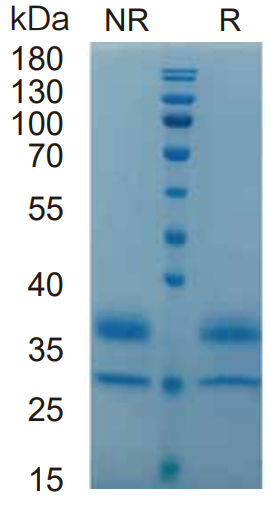 4 ug/lane protein was resolved with SDS-PAGE under non-reducing (NR) and reducing (R) conditions and visualized by Coomassie Blue staining.