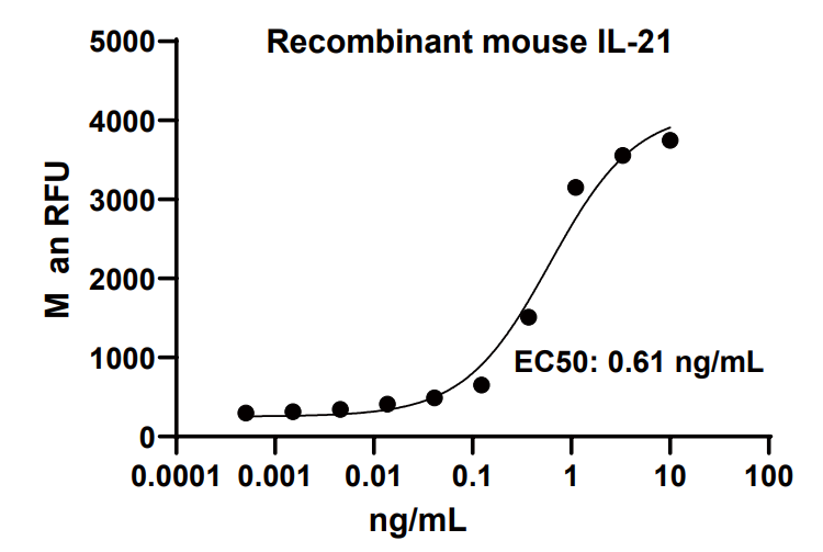 白细胞介素 21 (IL-21) 由活化的 T 滤泡辅助细胞 (Tfh)、Th17 细胞和 NKT 细胞产生。IL-21 调节 T 细胞功能的多个方面,共同刺激 CD8+ T 细胞和 NKT 细胞的活化、增殖和存活,并促进 Th17 细胞极化。IL-21R参与增强了活化 NK 细胞的细胞溶解活性和 IFN-γ 产生,但限制了静息 NK 细胞的扩增 。此外,IL-21 通过限制过敏原特异性 IgE 产生和肥大细胞脱颗粒来抑制皮肤超敏反应。IL-21/IL-21 R 系统失调会导致多种免疫疾病的发展。成熟小鼠 IL-21与成熟犬、人类、兔和大鼠 IL-21 的 aa 序列同一性分别为 66%、59%、58% 和 88%。?本品以液体形式提供,高纯度、高活性、低内毒素、无标签。