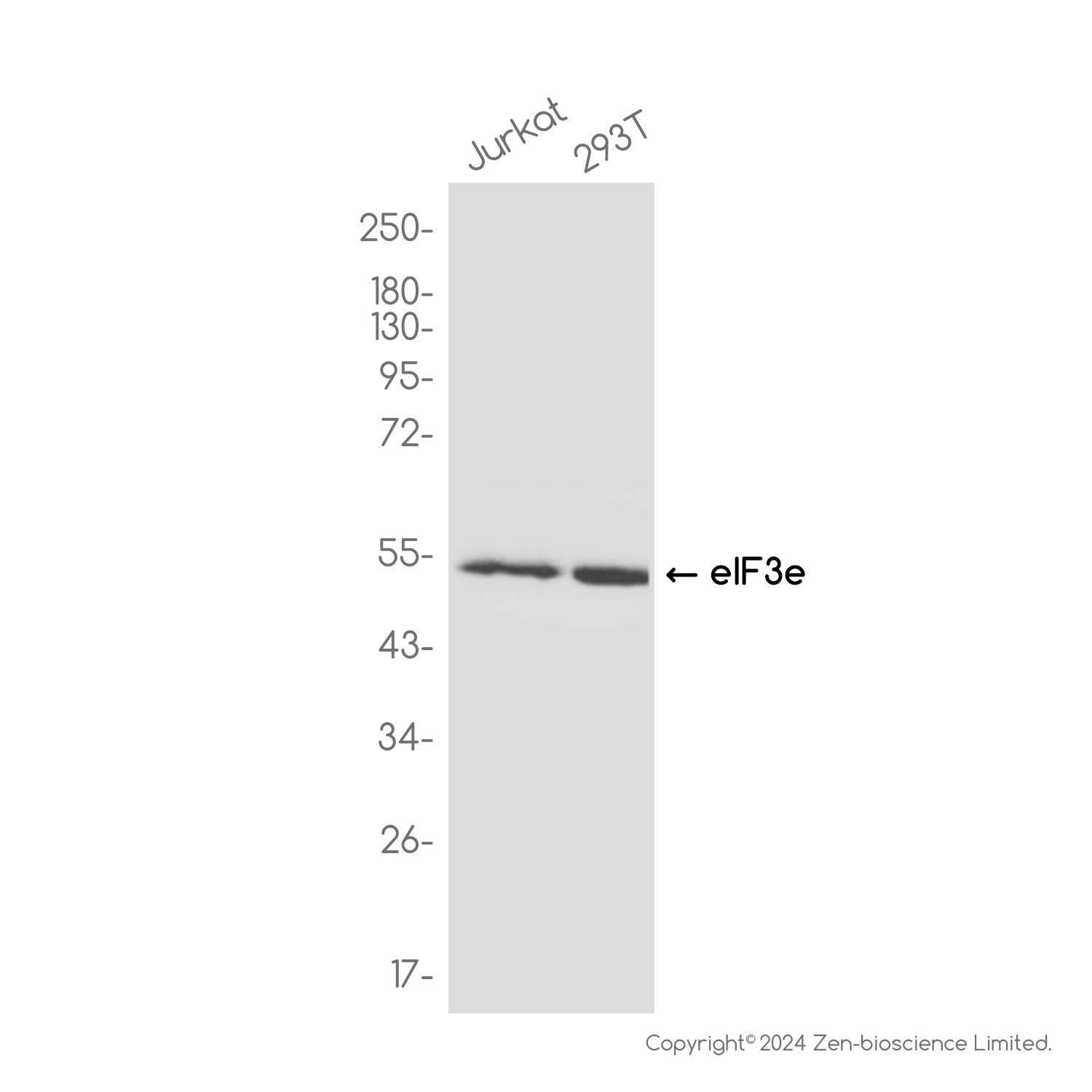 Western blot analysis of eIF3e in Jurkat, 293T lysates using eIF3e antibody.
