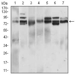 Western blot analysis of CD22 in L121 , Hela , HEK293 , Jurkat , OCM1 , A432 and NIH/3T3 lysates using CD22 antibody.