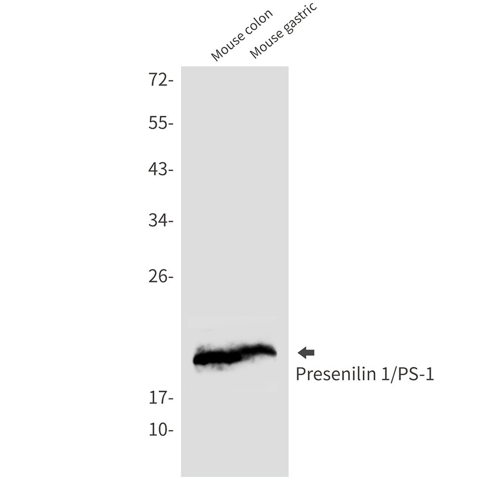 Western blot analysis of Presenilin 1/PS1 in mouse colon, mouse gastric lysates using Presenilin 1/PS1 antibody.