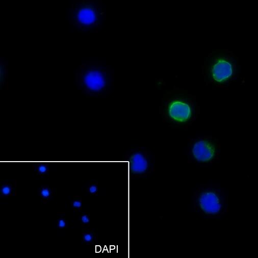 Immunocytochemistry analysis of CD5(green) in PBMC using CD5 antibody,and DAPI(blue).