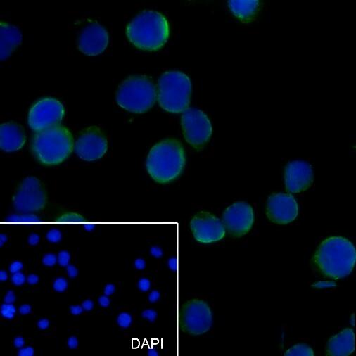 Immunocytochemistry analysis of CD89(green) in Jurkat cells using CD89 antibody,and DAPI(blue).