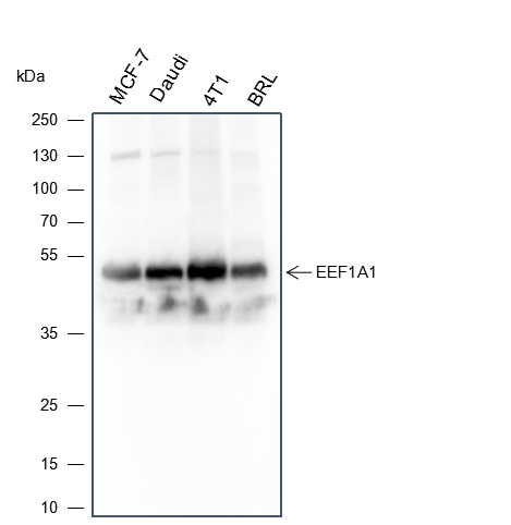 Western blot analysis of Elongation Factor 1A1 in lysates of MCF-7,Daudi,4T1 and BRL using Elongation Factor 1A1 antibody.