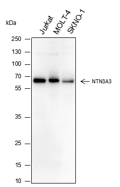Western blot analysis of BTN3A3 in lysates of Jurkat,MOLT-4 and SKNO-1 using BTN3A3 antibody.