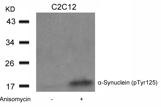 Western blot analysis of Phospho-alpha Synuclein (Tyr125) in C2C12 lysates untreated or treated with Anisomycin using alphaSynuclein (Phospho-Tyr125) antibody.