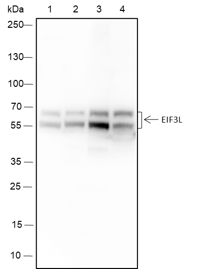 Western blot analysis of EIF3L in lysates of 293,Raw264.7,3T3 and HepG2 using EIF3L antibody.