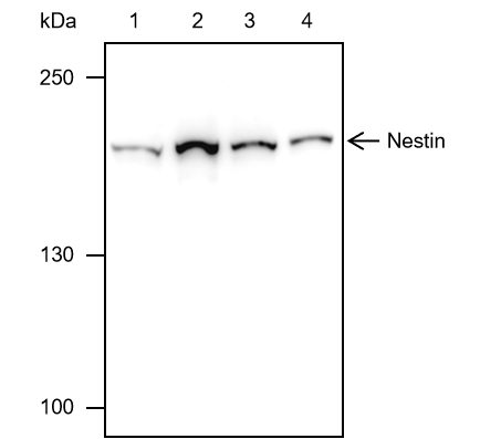 Western blot analysis of Nestin in lysates of MEF,C6,Mouse E12 brain and Rat E12 brain using Nestin antibody.