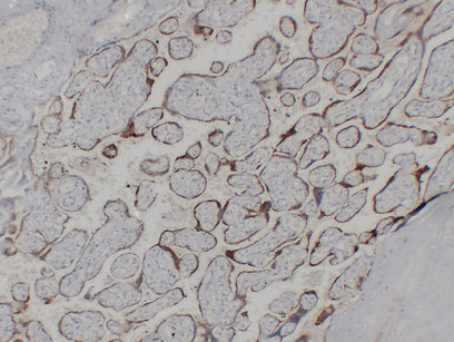 Immunohistochemistry analysis of paraffin-embedded Placenta using Choriogonadotropin Subunit beta 3/7 antibody.High-pressure and temperature Sodium Citrate pH 6.0 was used for antigen retrieval.